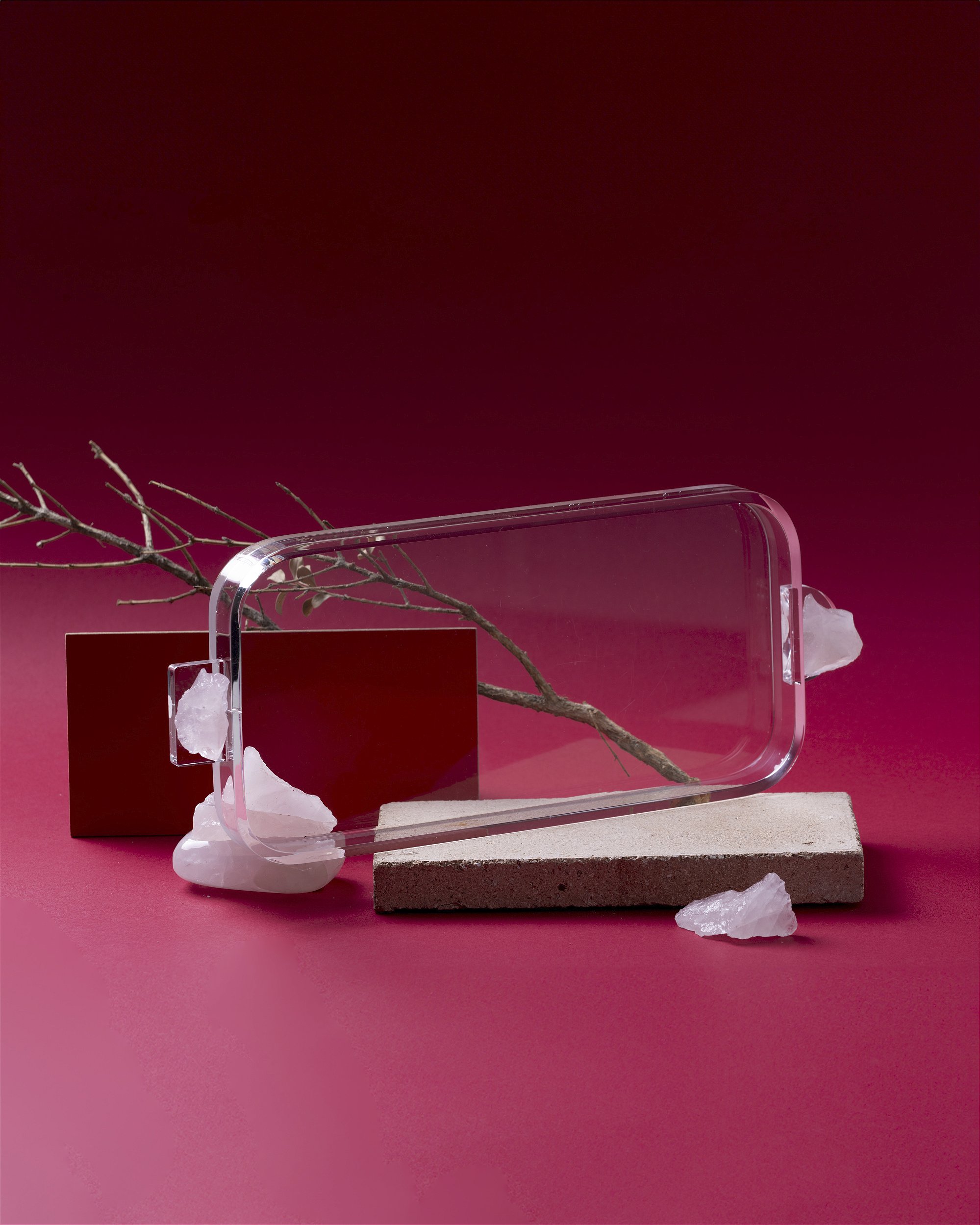 Crie um ambiente acolhedor e cheio de carinho com a Bandeja Be Love, uma criação exclusiva de Patricia Hagobian. Confeccionada em acrílico italiano, esta bandeja é resistente e durável, perfeita para adicionar sofisticação ao seu ambiente. Os dois cristais de quartzo rosa em cada pegador, conhecidos como cristais do amor e da harmonia, elevam a estética da bandeja enquanto promovem sentimentos de autoaceitação e compaixão, tornando-a um item essencial para quem busca um toque de elegância e bem-estar para o seu ambiente.